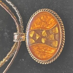 This elegant necklace features a stunning gold tone and brown pendant, perfect for adding a touch of sophistication to any outfit. The intricate design and rich colors make it a standout piece in any jewelry collection.