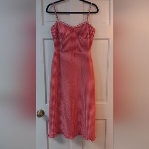Stylish red gingham midi dress. Features a fitted bodice for a slimming look and spaghetti straps. Ruffle hem. 18" P2P, 35" long. #Coquette, #cottagecore, #French girl chic, #summer #garden #tradwife