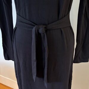 Elegant black dress with long sleeves. Features a stylish waist tie. Perfect for any occasion. Attached waist tie. Hand wash, dry flat. 95% Rayon, 5% Elastane.