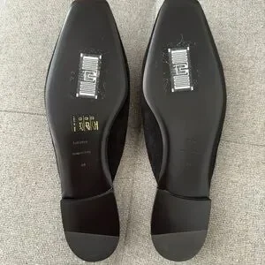 Elegant black suede slides. Slip-on design. Square toe shape. Perfect for any occasion.