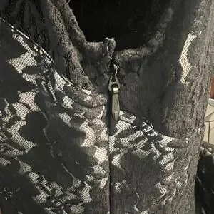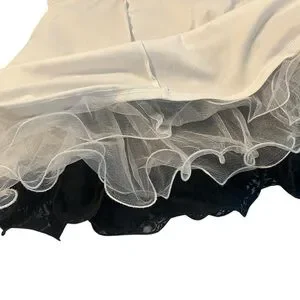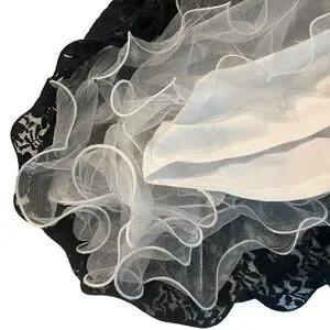 The skirt has multiple layers, including a white lining and white ruffled netting underneath the black lace.
