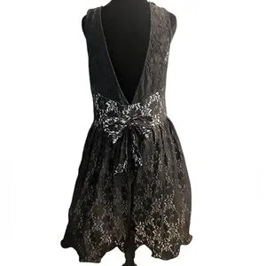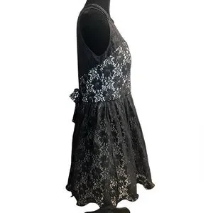 The rest of the dress is black lace over a white lining, with a deep V-back and a bow detail.