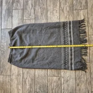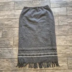 Get cozy this winter with this beautiful vintage Talbots wool-blend skirt. Features a classic gray heathered knit with a charming Nordic Fair Isle snowflake pattern along the hem. The fringed bottom adds a stylish, movement-filled "blanket skirt" touch perfect for the season.