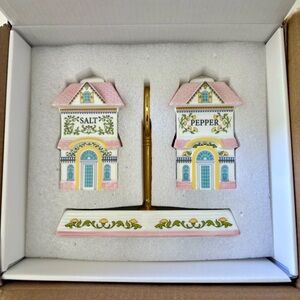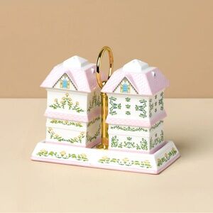 Adorable house-shaped salt and pepper shakers in pink and white with gold accents. Perfect for adding a touch of whimsy to your table.