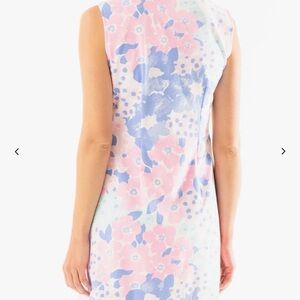 Charming dress with pastel floral pattern. Soft pink, blue, and white hues. Perfect for a casual outing.