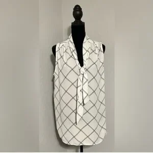 Elevate your wardrobe with this chic sleeveless blouse. Featuring a stylish white and black design, it's perfect for any occasion. Tie bow kneck line for added class.