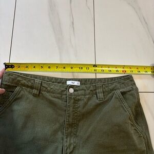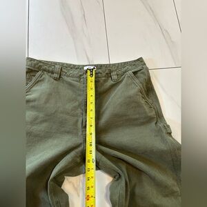 High-waisted green twill pants. Straight leg design. Comfortable and stylish.