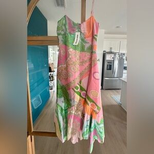 Vibrant dress with paisley and geometric patterns. Features pink, green, and orange hues.