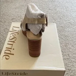Elegant metallic gold heels with a sturdy block heel. Features a modern cut-out design.
