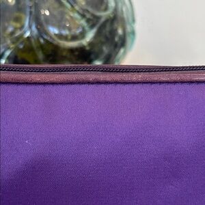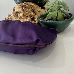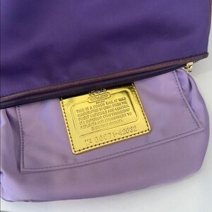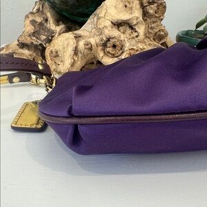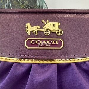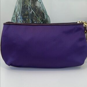 Chic Coach wristlet in vibrant purple. Features gold accents and a handy wrist strap, perfect for a special occasion. It will hold your phone, card holder and lipstick. This is EUC. Minor color loss on upper trim and superficial scuff on the front leather- both pictured. The interior is pristine so not sure it was ever used. $118 retail
