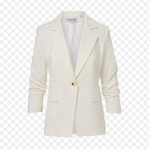 Chic cream blazer with a tailored fit. Features a single-button closure. Perfect for versatile styling.