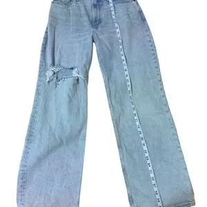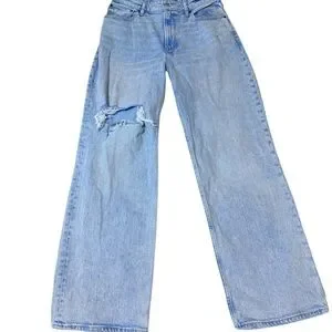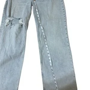 Chic light blue jeans with a stylish ripped detail. Perfect for casual outings.