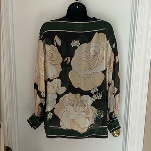 Farm Rio beautiful top size small. Front is shorter than back. Snap closure in front. Great layering piece! Great condition with no damage or stains. You will feel so cute in this top!