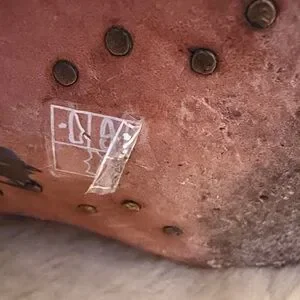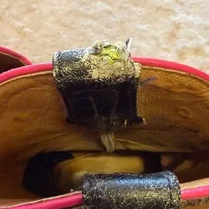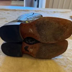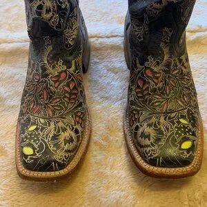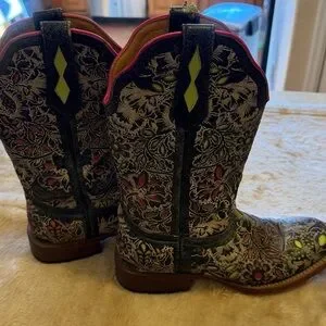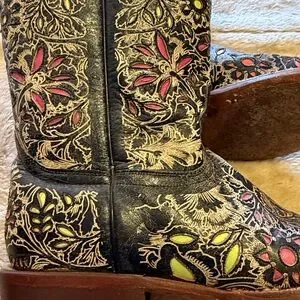 Square toed flower inlaid design.11 1/2” heel to toe. 12 1/2” tall. 4” width. Slight damage on right foot inner pull tab. Fashion forward inlaid flowers are pink and green