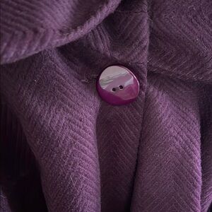 This Costa Blanca trench coat in a rich purple hue features a wide collar and a tie belt for a flattering silhouette. Its long sleeves and fitted design make it a versatile addition to any wardrobe, perfect for cooler seasons. Excellent condition, size 6.