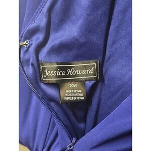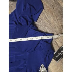 Stunning Jessica Howard Woman cobalt blue evening gown in size 20W. Features an elegant draped neckline, flutter/ruffle sleeves, and a flattering gathered waist with a decorative rhinestone/crystal side brooch accent. Full-length maxi skirt with a graceful flow. Perfect for weddings, mother of the bride, or formal galas. New with tags.