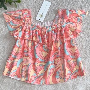 Adorable, orange, pink, and blue retro designed, babydoll (flowy) top 🧡! Perfect for her spring and summer wardrobe!