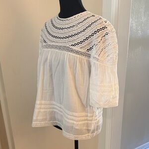 This elegant white lace top is perfect for any occasion. Its intricate design adds a touch of sophistication to your wardrobe. Size M.