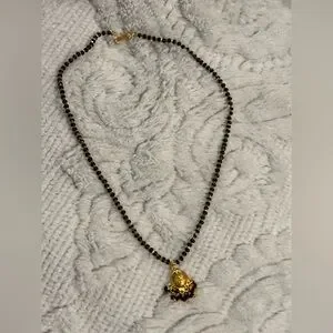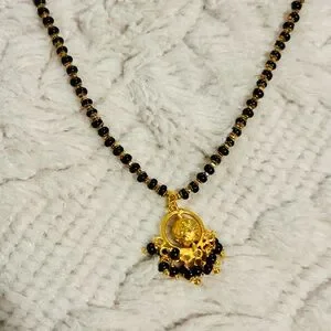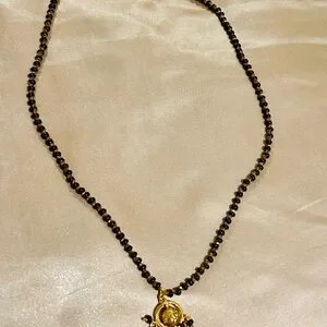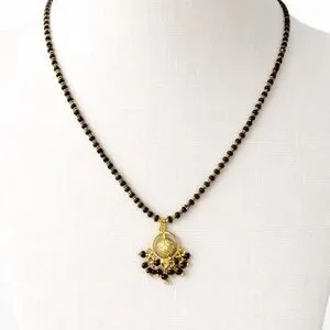 Black & gold beaded chain with ornate gold-tone pendant and black bead fringe. Elegant, traditional, and perfect for festive or everyday wear.