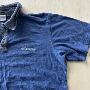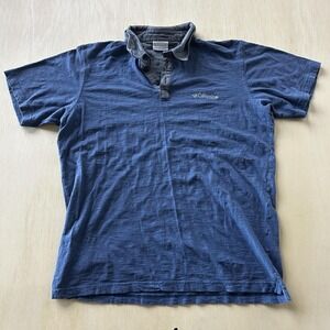 Pre-owned Columbia polo shirt with overall wash wear, fabric softening, and noticeable wrinkling from prior laundering and storage. Color shows mild fading throughout, but fabric, collar, placket, and hems remain intact without holes, tears, or stains. Embroidered chest logo and interior labels are secure and legible for continued casual warm-weather wear.