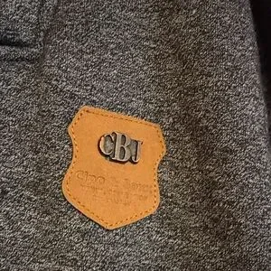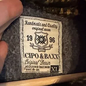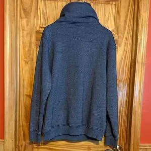 Trendy blue/gray hoodie with tan drawstrings and button details. Features a cozy patterned double collar lining.