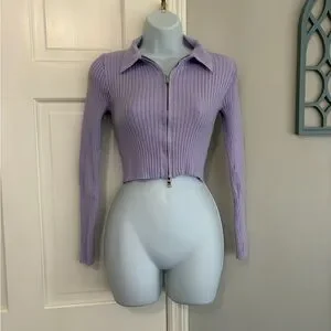 Chic lavender ribbed shirt. Features zip-up front and long sleeves. Ideal for casual outings.