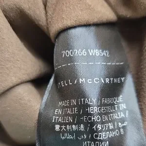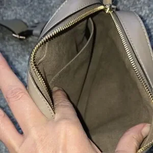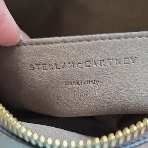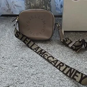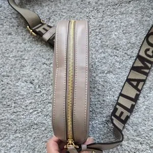 Stella McCartney crossbody bag in taupe color. Features a prominent logo strap. Like new condition with one scuffing at strap as shown in pictures