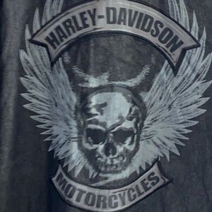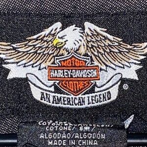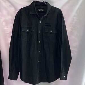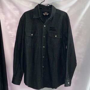 Classic charcoal shirt with HD design on all snap buttons Features dual chest pockets and Harley-Davidson logo.EXCELLENT CONDITION CLEAN LENGTH MEASURES APPROX 31” from shoulder to hem sleeves measure approx 25” chest measures approx 23” from side to side