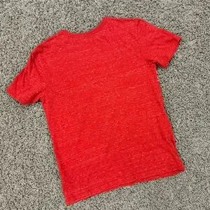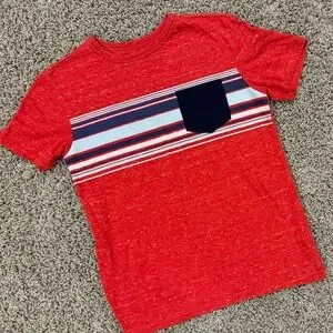 Heather red front pocket tshirt with white and blue stripes.