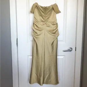 A signature House of CB silhouette — structured corset bodice meets draped satin midi skirt. This olive tone photographs beautifully and is perfect for weddings, formal events, cocktail parties, or European summer evenings.