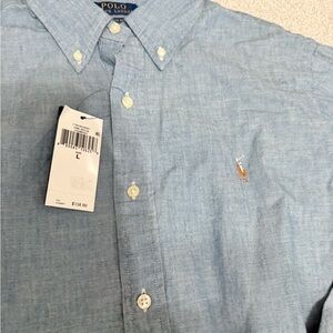 Classic light blue button down by Polo Ralph Lauren. Features iconic logo embroidery. Ideal for casual wear.
