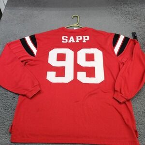 Tampa Bay Buccaneers mens XL red Reebok Gridiron Classic jersey-style long sleeve shirt celebrating Warren Sapp 99 fandom for NFL game days, display collections, or relaxed everyday wear.