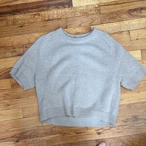 Short-sleeve beige sweater. Ribbed cuffs and hem. Soft knit fabric.