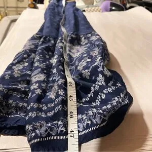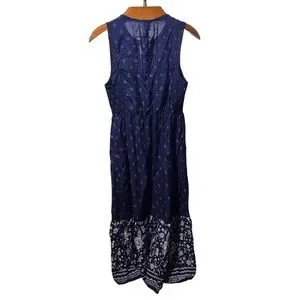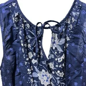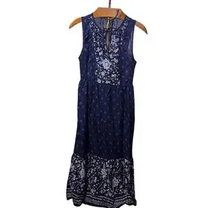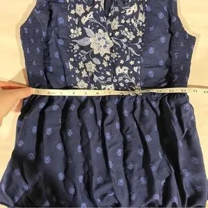 Chic navy blue maxi dress with floral patterns. Sleeveless design with side smocking. Perfect for casual outings. Embroidered print (not actual embroidery) gives a fun festival, boho, summer vibe. In good preowned condition.