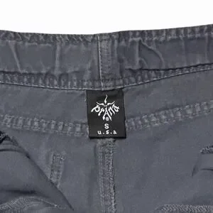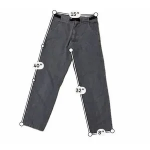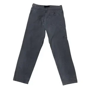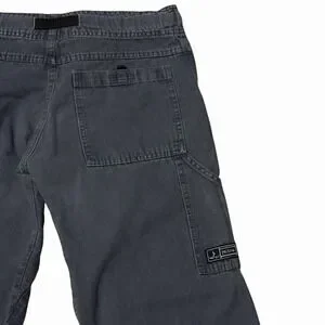 These Vintage Prana Pants are a unique and stylish addition to any wardrobe. Made in the USA, the belted design adds a practical and comfortable element to the classic chino style. The gray canvas fabric and mid-rise waist give them a rugged and versatile look, perfect for outdoor activities or casual wear. With a straight leg fit and slash pockets, these pants offer both functionality and fashion in a solid pattern that can be worn year-round. Upgrade your closet with these USA-made gorpcore pants that showcase a blend of nature-inspired design and 90s aesthetic.
