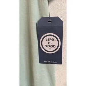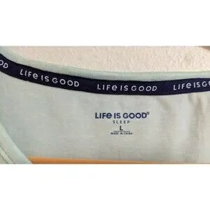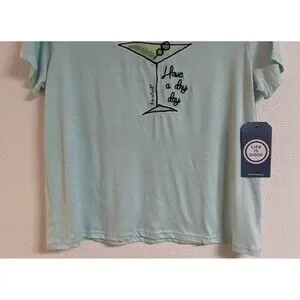 This NWT Women's Life Is Good "Martini" Theme Sleepshirt in size Large is a super soft and cozy addition to any sleepwear collection. The shirt features a graphic print Martini theme, short sleeves, V-neckline, and pull-over closure for easy wear. Made from a blend of recycled poly and spandex, this lightweight shirt is machine washable and perfect for the seasons of summer, fall, and spring. The seafoam green color adds a touch of relaxation to this comfortable and stylish pajama top shirt from the trusted brand Life is Good.