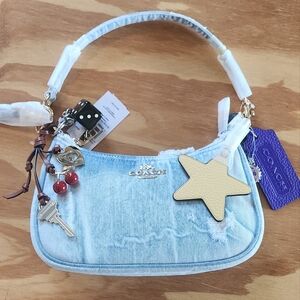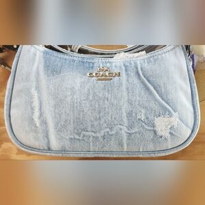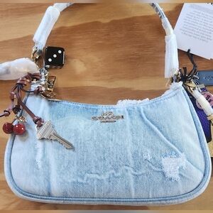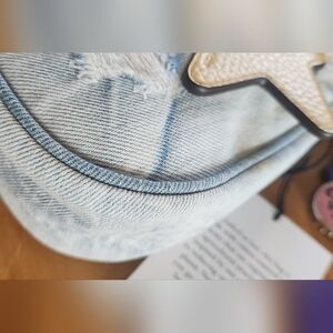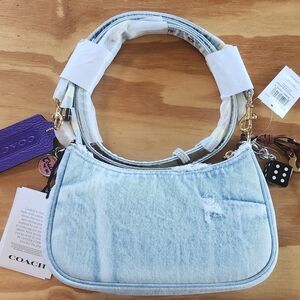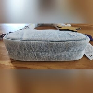 Denim smooth leather refined calf leather and soft pebble leather Inside multifunction pocket Zip-top closure recycled polyester lining Detachable handle with 8 1/2 drop Detachable strap with 22 3/4 drop for shoulder or crossbody wear 9 1/2 (L) x 6 (H) x 3 (W) Denim specially treated for a love-worn look Exclusive of trim this denim style is crafted of cotton sourced from farms that use regenerative agricultural practices—those that help to maintain and rejuvenate land increase biological diversity and soil health and could lead to increased carbon absorption Style No. CDY76