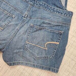 American Eagle Outfitters denim shortalls in a classic medium wash. These overalls feature a unique button-front bib design with a drawstring neckline and adjustable tie shoulder straps. Crafted from 100% cotton denim, they offer a sturdy yet comfortable fit with traditional five-pocket styling and signature eagle embroidery on the back pockets. Perfect for layering over tees or tanks for a casual, warm-weather look.