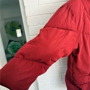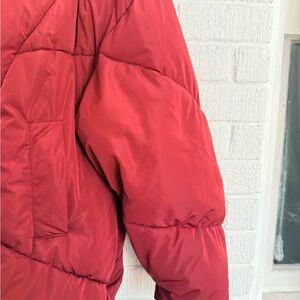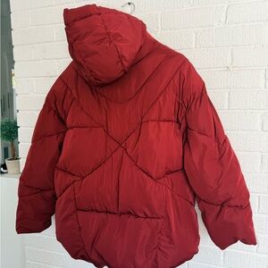 Stylish red puffer with a cozy hood. Perfect for chilly days.