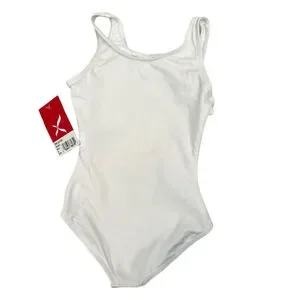 Classic white tank leotard by Capezio, style TB142C, perfect for ballet class, rehearsals, uniforms, or recital basics. This timeless scoop front and back design offers a clean, professional look and comfortable stretch for full range of movement. A must-have staple for any young dancer’s wardrobe.