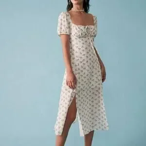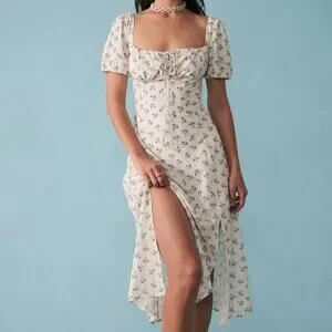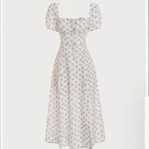 Beautiful dress perfect for a picnic or brunch! The dress is a size small. The model in the stock pics is wearing a size XS. I'm between XS and small and it's a little loose on me. For reference, I'm 5'2 and 115 pounds.
