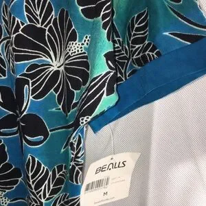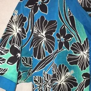 Add a touch of tropical charm to your wardrobe with this beautiful Coral Bay tunic top, new with tags. Featuring a vibrant floral print in black and white over a cool blue and teal background, this breezy top is made from 100% cotton for breathable comfort. Decorative stitching around some of the floral designs adds texture and detail. The split neckline includes a tie for added style.