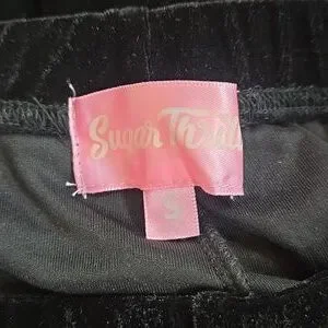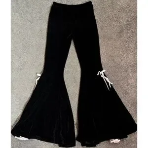 Dolls Kill Sugar Thrillz black velvet bell bottom flare pants with pink lace panels and bow detail. Stretchy material with elastic waist. Inseam is 34 inches. Rise is 11 inches. Waist is 12.5 inches across the front. Excellent condition. Size small.