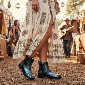Step out in style with these vibrant ankle boots featuring intricate blue and silver metallic butterfly hand painting with green vines and purple flowers too. Perfect for adding a pop of color to any outfit.