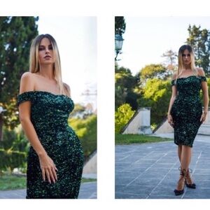 BNWT Retro Stage GREEN 1960S SEQUINS OFF-SHOULDER PENCIL DRESS Size L $99.89 USD