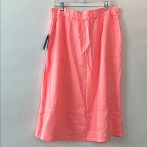 Stylish coral A-line skirt with button-front design. Ideal for versatile wear. Linen/Rayon blend. Pockets & elastic waistband.