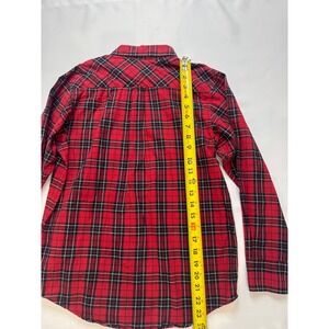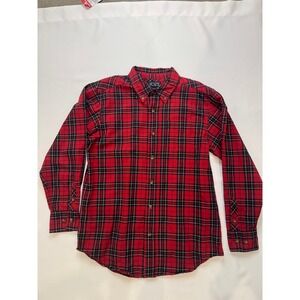 Classic red and black plaid button-down shirt offers a timeless look for any young wardrobe. Crafted from breathable cotton, it features a crisp button-down collar, a functional chest pocket, and adjustable cuffs for a polished yet comfortable fit. This versatile piece is in excellent condition and ready for its next adventure. Perfect for family photos, holiday gatherings, or casual school days.