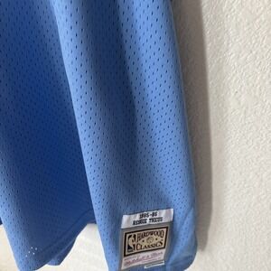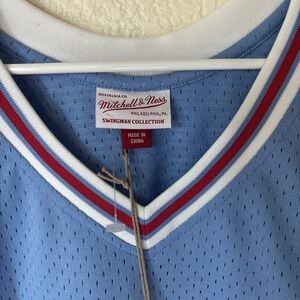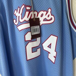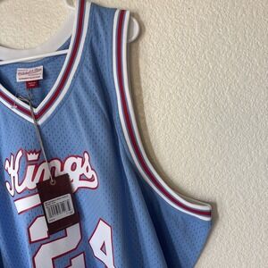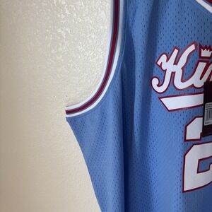 The Reggie Theus 1985 Mitchell & Ness HWC NBA Swingman Jersey is a size 5XL blue jersey featuring the Sacramento Kings team logo. This officially licensed National Basketball Association (NBA) fan apparel is perfect for basketball enthusiasts looking to represent their favorite team in style. Made by the renowned brand Mitchell & Ness, this jersey is a must-have for any Sacramento Kings fan looking to show their support in a classic and iconic way.