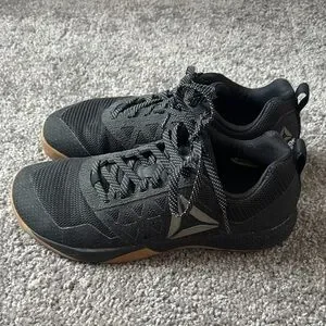 Sleek black Reebok sneakers with gum soles. Ideal for gym and everyday use.