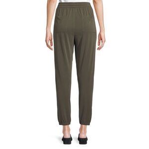 Vince jogger pants in a muted olive green tone. Made from a soft and drapey modal-polyester blend (68% modal, 32% polyester) for a relaxed yet elevated look. Features an elastic waistband with drawstring, elastic ankle cuffs, and back patch pocket. Style #V510283163.
